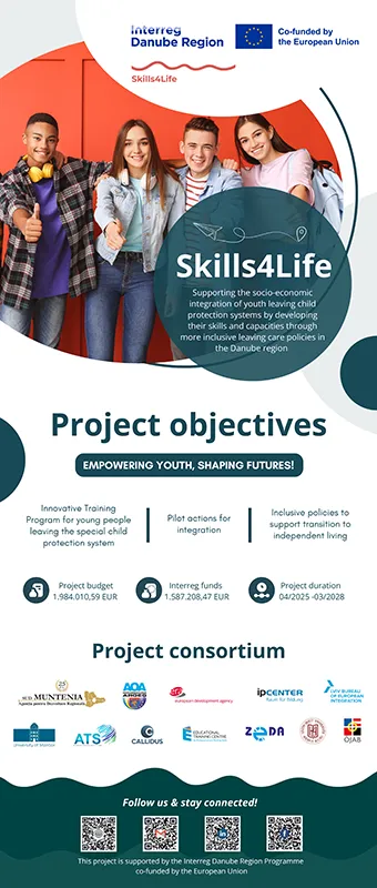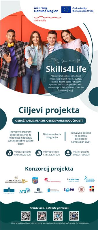 Skills4Life odgovara na zajednički izazov zemalja Podunavlja – nisku razinu socijalne uključenosti i zapošljivosti mladih koji izlaze iz alternativne skrbi. Cilj je unaprijediti politike izlaska iz skrbi i razviti inovativni obrazovni program za razvoj osobnih i profesionalnih vještina, mentorstvo i podršku za zapošljavanje i samostalni život.